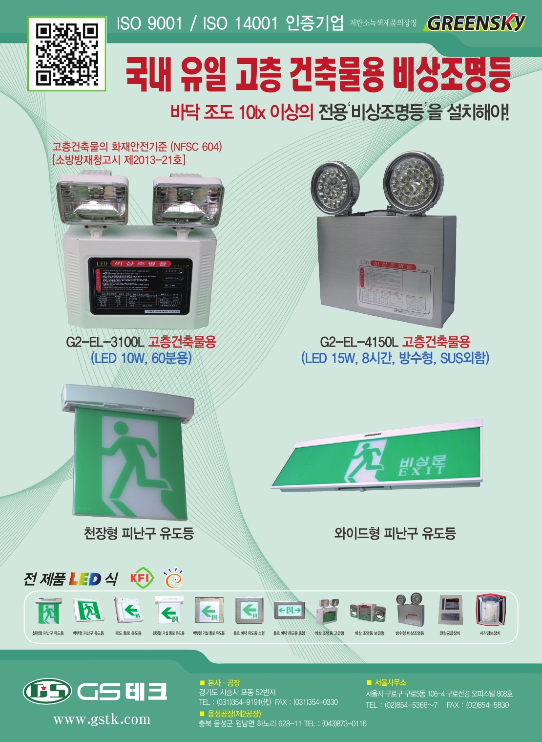 국내 유일 고층 건축물용 비상조명등 최근에 개정된 안전기준에 따라 고층 건축물에는 의무적으로 고층 전용 비상조명등을 의무적으로 설치해야 합니다. GS테크에서는 고층 건축물용 고성능 LED 비상조명등을 국내 최초로 개발했습니다. (바닥조도 10lx 이상) 뿐만 아니라, 고층용 비상조명등 이외에 방수형 비상조명등 또한 새롭게 출시하였습니다. 방수형 비상조명등은 조도와 배터리 용량, 방수성능을 동시에 잡아 고층건물은 물론이고 습기가 많은 특수 장소에서도 활용할 수 있는 ‘하이엔드급’ 비상조명등입니다. 제품에 관련된 자세한 사항은 고객센터로 문의 부탁드립니다.