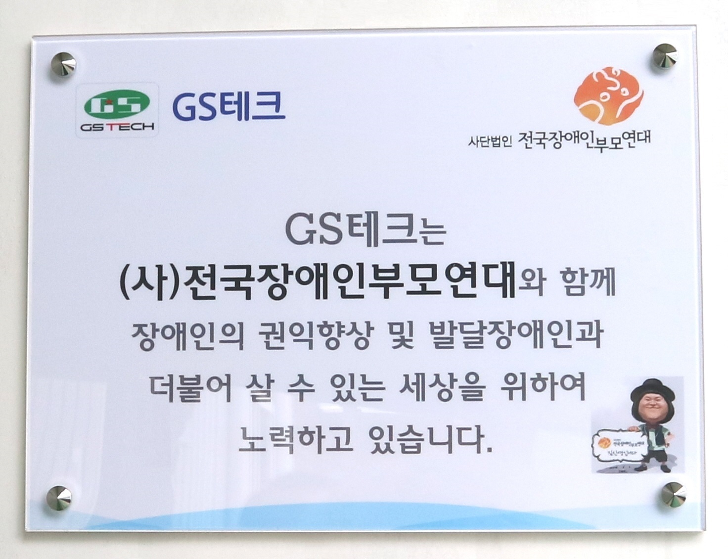 저희 GS테크는 사단법인 전국장애인부모연대와 함께 장애인의 권익향상 및 발달장애인과 더불어 살 수 있는 세상을 위하여 노력하고 있습니다.
