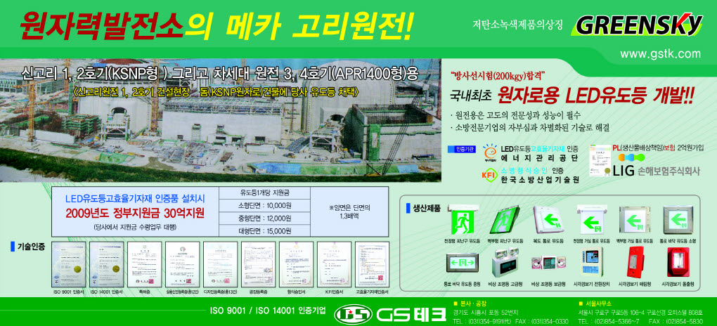 ** 관련 신문광고 첨부파일 참조(09. 7. 10 소방방재신문) ** 당사는 08년 3월 국내 최초로 원자로에 설치하는 LED유도등을 개발, 방사선 시험(400kgy = 방사선 40년 투과)에 합격하였습니다. 현재까지는 국내에서 당사뿐이며, 09년 8월에는 신고리원자력 1, 2호기에 설치될 물량(격납건물용 外 1200개)을 수주해서 9월에 납품할 예정입니다.